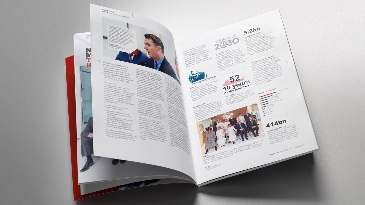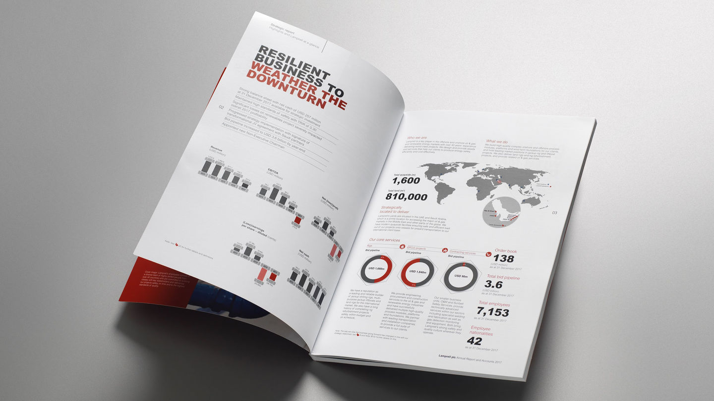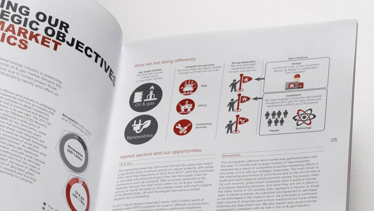 In 2017, the downturn in the oil & gas industry continued to affect Lamprell’s traditional sources of revenue. The company also struggled in the renewable foundations market. Although there was a lack of projects to showcase, we were briefed to design and produce a forward-looking report that positioned Lamprell as a principal contractor in the energy sector. There was also the need to demonstrate stable management and to articulate how Lamprell was creating opportunities to optimise the anticipated upturn.